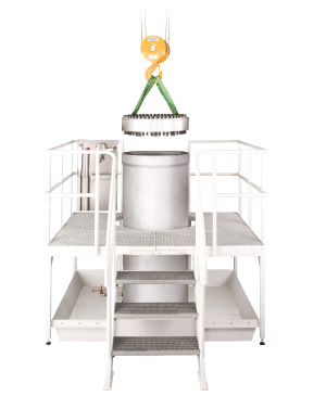 Mounting platform for vertical mounting of the vessel described above, with stairs and control desk and safety railing on both sides.