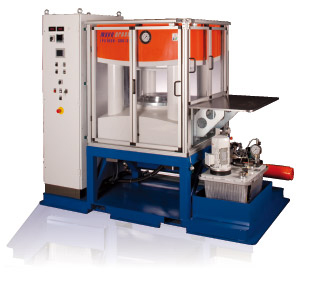 The supplied press includes a SPS control unit (Siemens) enabling the manual operation of the press in low and high pressure operation. The switch cabinet houses a digital pressure indicator. The press itself has an analogue manometer. All important switching states and values can be transmitted to a PC via the Ethernet interface. The PC, on the other hand, presets target timing and pressure values.
